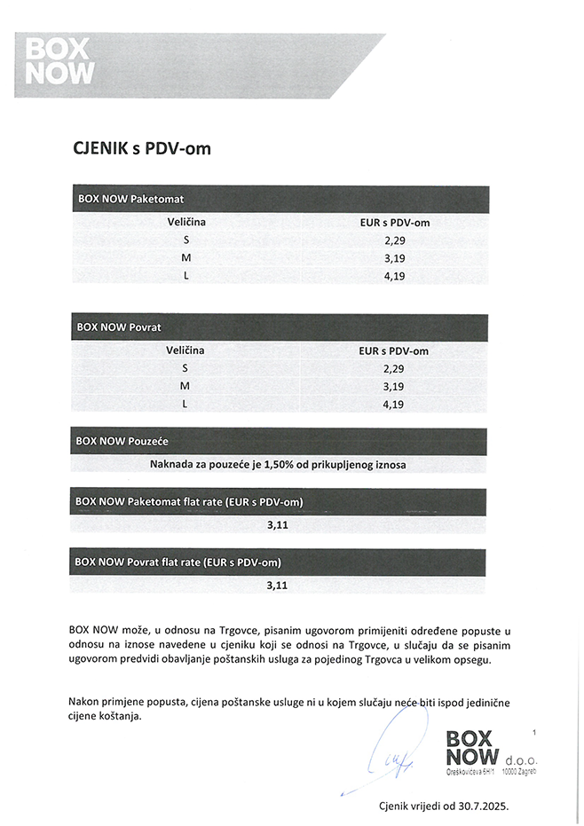 Postal services in relation to the Other senders will be paid in advance, via the website www.boxnow.hr.