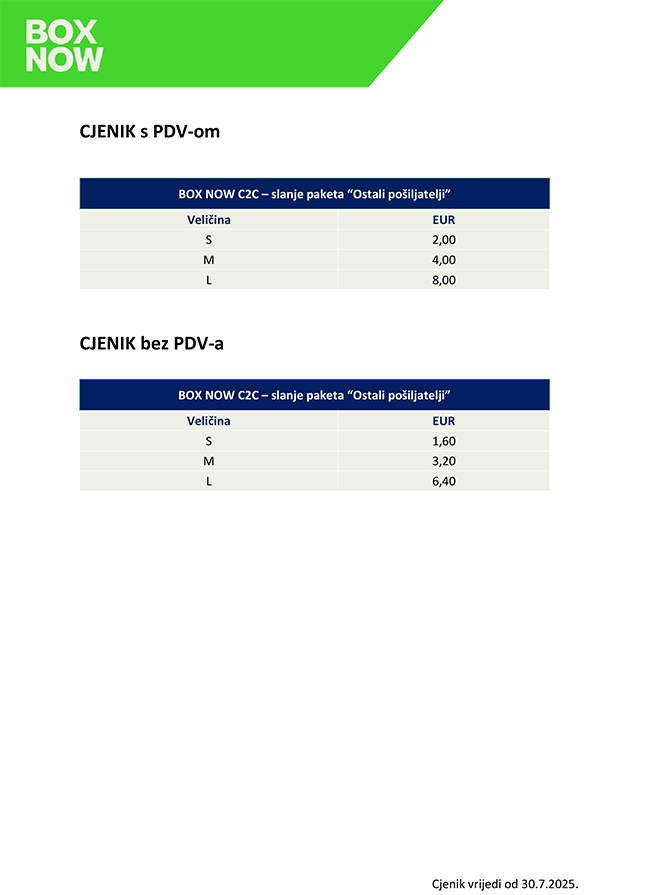 The prices of BOX NOW postal services are included in the price list published on the website www.boxnow.hr. The price list is updated from time to time to respond to changes in market conditions and user requirements. From the day of publication of the new price List, the current price List ceases to be valid. In case the Trader wants the processing of his postal item to be covered by insurance, it is necessary to conclude a separate agreement with BOX NOW.